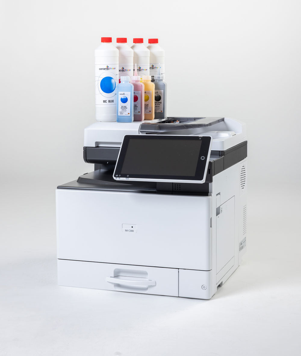 Der Ricoh C300F ist das All-in-One-Kraftpaket der neusten Generation für den keramischen Digitaldruck im A4-Format – ideal für kreative Anwendungen wie Porzellanplaketten, Tassen oder kleine Fliesendekore. Als speziell modifizierter Drucker von MZ Toner Technologies verbindet er brillante Druckqualität mit integrierter Scan- und Kopierfunktion – kompakt, vielseitig und bereit für den professionellen Einsatz.